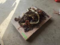 6 inch wide tow strap, (7) ratchet straps, (4) cable extensions, (2) garden hoses, incomplete mechanics driver set