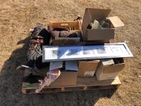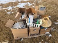 (4) leather cowboy hats, (2) wooden Face decorations, (1) kid's bike, wooden chair, vacuum, meat grinder, electric hot plate, (2) pan roller pans, metal storage box filled with hats, travel pack, wok, etc.