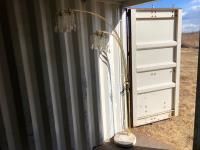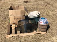 (2) metal boxes, display shelf 52 inch L X 10 inch D X 31 inch H, (2) tables (1) 25 inch X 19 inch X 20 inch high, (1) 26 inch X 22 inch X 20 inch high