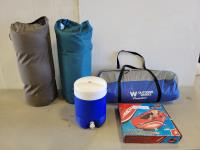 6 person tent, (2) sleeping mattresses, water cooler and inflatable boat (unused)