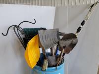 pots, tools, utility sink, wheelbarrow, snow scrapers