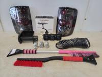 adjustable car tray, hose, climate control in fahrenheit, lug nut caps, trailer winch, vehicle lights, snow brushes