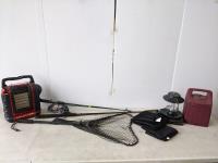 Mr. Heater portable buddy propane heater 9000btu, (2) fishing rods, foldable Rapala net (has holes), Coleman propane lantern, (2) large net bags