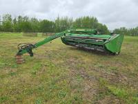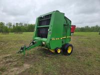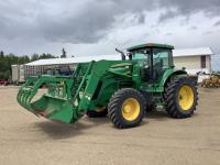 John Deere 640R loader, Q/A, bucket, grapple, mid mount hydraulic connection, John Deere 6.8 L 6 cylinder 155 HP, engine, 123 PTO HP, 20 speed partial power shift transmission, cab, left hand reverser, rear differential lock, joystick, A/C, radio, buddy seat, dual cab doors, silage screen, grill guard, 540/1000 PTO, 3 point hitch, 3 point hitch exterior control, 3 rear hydraulic outlets, rear wheel weights, 420/85R28 front tires, 520/85R38 rear tires