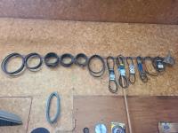 Tire chains, fire extinguisher, shackles, compressor pump, boomers, funnels,