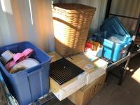 16 inch x 19 inch x 24 inch high wicker basket, (2) 72 inch high up-lights (unused), (2) wire grills 13 inch x 14 inch, (3) unused swing seats, quantity of dishes, miscellaneous houseware