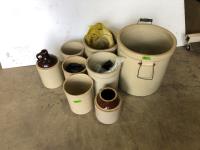 Corres Pomdent Underwood typewriter, drill press, (4) antique oil lamps, (3) vintage crank handles, vintage 28 inch level, 5 gallon Texas gas can