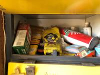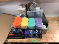 Superchips Flashpag code reader, quantity of various spark plugs, Echlin ignition coil, quantity of points, quantity of fuel systems/carburetor parts, vintage inspection lamp, shop paper towels, misc shop supplies ** Note: cabinets not included **