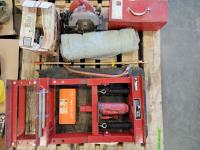 Shur-lift shop press s/n: 172, tap and die set, hand saw with replacement blades, canvas sheet, tool box with contents, milwakee circular saw s/n: 632-32261, electrical boxes