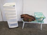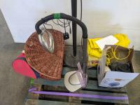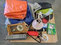 Radio, clack, lamp, chair cushion, tarps, window kit, pipe wrap insulation, wire mesh