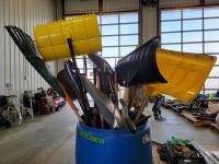 Snow shovels, rakes, shovels, prybar, broom, mop