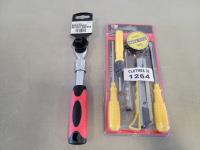 16 clip socket rail, files, valve lapping tool, snap ring pliers, torque drive plus power bits, universal brake adjusting tool, multi-driver