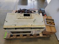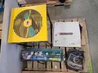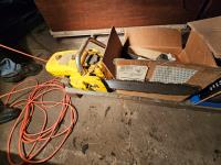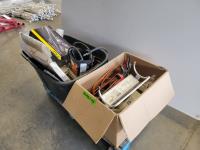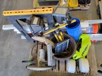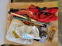 area fans, window insulator kit, extension cords, snow fence, sliding door hardware, saw horse, TradeMaster 14 inch cut-off saw: single phase s/n: 5189