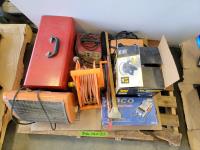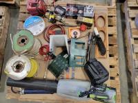 Dual sink drain, caulking guns, pry bar, hand saw, jitterbug sander, hot air paint remover, 1/2 inch reversible drill, vari-orbit scroll saw, three-way spray gun, electrical cords, walkie-talkies, Wen router, shower faucet, 3/4 inch impact wrench, 1/4 inch angle/die grinder set, drill grinding attachment, chainsaw case