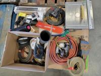 Torch heads, 2 inch ball hitches, grease guns, shop light, extension cord, propane tank torch attachment, motorcycle jack