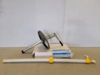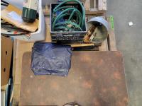 Dolly wheels, skil table saw, greengrit recycled glass, drill bit kit, vise, extension cord