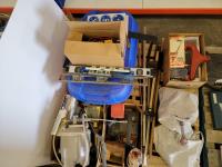 Pedestal grinder, 7 inch angle grinder, black plastic role, paint sprayer, helmet, (2) 4.80-8 trailer tires