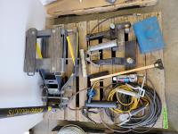 super putty, hand crank winch, dust masks, car jack, hand tools, anti-freeze tester, bottle jack, grease gun, dolly wheels, outlets, tail light, winch receiver, level, brush cutter attachment, cylinder hone, threading tap, frame repair equipment 10 ton power-kit, hardware, pulleys, hose clamps, clamp meter