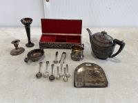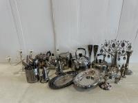 Teapots, kettles, candelabra, candlesticks, goblets, salt and pepper, serving plates, gravy boat, egg cup, utensils, Family Tree photo stand