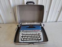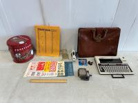 Briefcase, typewriter, Dymo tapewriter, pencil sharpener, Inter-office mail envelopes, letter stencil, mail holder, ruler