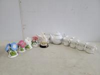 Corelle teapot and (8) cups, (4) lenox bells, porcelain swan figure