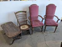 1468 Wooden Coffee Table, Antique Wicker Rocking Chair (2) Arm Chairs
