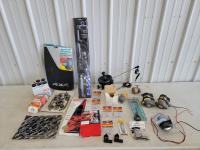 (2) Tackle boxes with gear, Qty of lubricants, boat anchor, (2) boat fuel tanks, Qty of fishing rods, (3) paddles, net