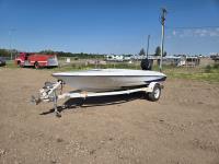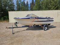 closed bow, fish finder, radio, (2) captains chairs, 50 HP Mercury outboard motor, fuel tank, S/A boat trailer, 155/80R12 tires