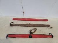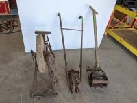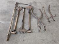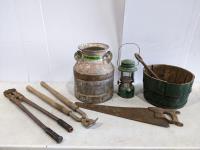 Milk can, Coleman lantern, half barrel with nails, bolt cutters, hoof trimmer