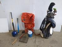 1168 Golf Clubs and Bag, (2) Baseball Bats and Helmet, Rigid Frame Backpack