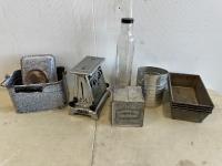 enamel lunch box, Westinghouse Turnover Toaster (no cord), Lipton's tea & coffee tin, Victor 5cup flour sifter, (4) Ekcoloy loaf pans, bottle