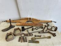 assorted wrenches, metal last, spurs, neck yoke with metal wire hooks