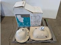 1166 One Piece Toilet and (2) Ceramic Bathroom Sink Basins