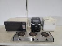 1153 Sanyo Breadmaker, Microwave, Ice Maker and Triple Burner Kettle Buffet