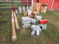 63 Qty of Electrical Lights & Boxes, Cable Prep Tools, (2) Circular Tarps 12 & 15 ft