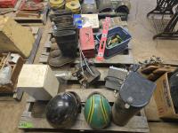 (3) Welding Helmets, (2) boxes of welding rods unopened, Bosch cordless drill with charger, (3) 30 ft Dyna Lock self retracting lanyards, Makita corded angle grinder, welding gauges, miscellaneous climbing gear