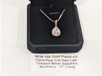 5021 Smartlife 18K Gold Plated 4.0 Carat Pear Cut Halo Lab-Created White Sapphire Necklace - 17 Inch Long (Unused)