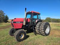 Allied 795 loader, 84 inch bucket, grapple, Case 8.3 L 6 cylinder engine, 108 PTO HP, 12 speed partial power shift transmission, cab, rear differential lock, A/C, radio, 540/1000 PTO, 3 rear hydraulic outlets, rear wheel weights, 11.00-16 front tires, 18.4-38 rear tires