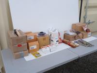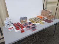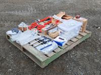 (1) Pipe bender kit, (10) 50 lb safety bungy cords, (4)-24 oz ball peen hammers, (2) Milwaukee box cutters, (1) Milwaukee 5-piece replacement blade pgk, (2)-24 oz rubber mallets, (2)-16 oz rubber mallets, (4) replacement cutter wheels, (1) Malco 1 inch hand notcher, (2) Wiring Pro Heavy Duty wire stripper/ cutter, (4)-12 inch dual cutting hack saws, (1) pgk-20 inch and 24 inch rubber strap wrenches, (1) adjustable wrench, (2)-18 inch powder coated plates, (4) pairs O/S Watson winter gloves, (1) faucet re-seater kit, (4) light duty sprinklers, (1)-3 inch shark tooth cutter, (2) Flex hose protectors with gripper, (2) deburring tools, (1) pressure test kit, (2)-50 watt LED bulbs, (1) Pressure test kit, (2)-50 watt LED bulbs, (1) T-handle grip, (1) battery tester, (3)-40 watt bulbs, (1)-10 pack of 6 inch hacksaw blades, (3)-1/2 inch nipple extractors, (1) 237ml Cool Gel, (1) pair Ansell heavy labour gloves, (1) 1-3/4 inch spade cutter