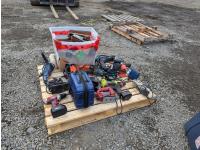 (1) Carpenter's Belt containing small hand tools, (3) Impact Tools, (2) Pry Bars, (1) Brad Nailer, Multiple screw drivers and other small hand tools, (2) Rocawell impact tools, (1) Battery Charger, (1) battery, (1) set Knee Pads (hard shell), (1) Drill bit set.