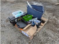 Air nail gun, paint sprayers, tool box with assorted hand tools, electric fillet knife, respirator & cartridges, nails