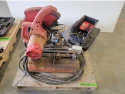 Chop saw, angle grinder, angle grinder for parts, assortment of hand tools, oil pan
