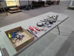 Various sizes of combination wrenches, caster wheels, screwdrivers