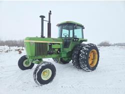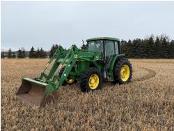 John Deere 640 loader, Q/A, grill guard, mid mount hydraulic connection, 99 HP, diesel engine, 16 speed PowrQuad partial power shift transmission, cab, left hand reverser, front differential lock, joystick, A/C, radio, air ride seat, 540/1000 PTO, 3 point hitch, 2 rear hydraulic outlets, rear wheel weights, 14.9-24 front tires, 18.4-34 rear tires, self levelling loader