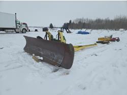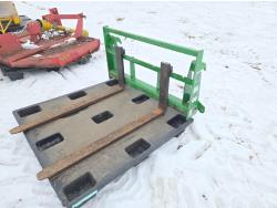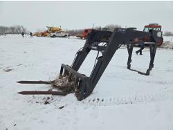 John Deere 633 loader, Q/A, 80 inch bucket, grill guard, 90 HP, diesel engine, 24 speed Auto Quad partial power shift transmission, 50 Km top speed, cab, joystick, A/C, radio, air ride seat, buddy seat, 540/1000 PTO, 3 point hitch, 4 rear hydraulic outlets, 480/70R28 front tires, 580/70R38 rear tires