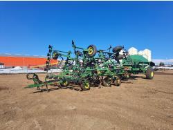 10 inch spacing, single shoot openers, rubber packers, 4000 Series monitors, 2.5 inch spoons grass/herbicide attachment, c/w Bourgault 3195 tow behind 3 compartment cart,