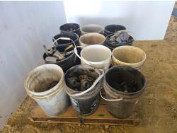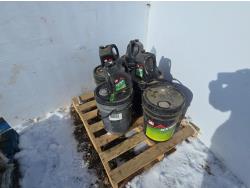 (3) 5 gallon UFA white barn paint, part pail of grey enamel, (2) Hemp Adur Quattro, (1) 5 gallon of brown paint, (1) 5 gallon of Hempthane, (1) part pail of stain block