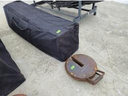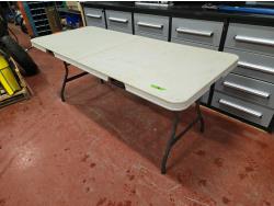 heat lamp, (2) poly trays, selection of disposable cutlery and cups, (4) stainless food warmers, table covers, poly cutlery tray, (3) poly totes, miscellaneous food related items, 30" X 72" folding poly table