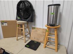 12 Ceiling Light, (2) Stools, Electric Fan, Bathroom Scale & Chopping Block