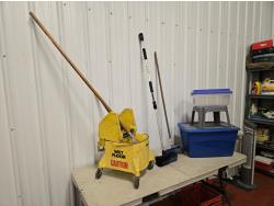 Mop Bucket, (2) poly totes, Poly stool, (2) brushes